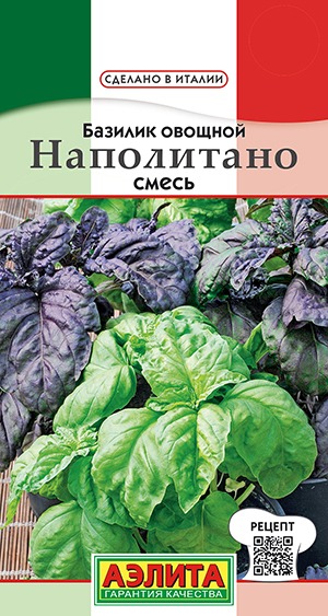 Новинка в серии Наполитано – яркая смесь красно- и зеленолистного базилика. Сорт, более известный как Napolitano «LETTUCE-LEAF», отличается высокой урожайностью и длительной отдачей продукции. Хорошо удается в горшечной культуре (объем контейнера не менее 2-3 л). От всходов до первой срезки молодой зелени проходит 30-35 дней. Высота крепких, густых растений около 35-40 см. Крупные ароматные листья используются в свежем и сушеном виде в кулинарии: для соусов, салатов и закусок, при мариновании овощей.