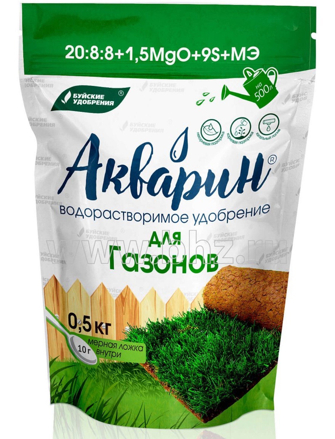 Акварин» для газонов входит — водорастворимое удобрение, в состав которого азот, фосфор, калий, магний, сера и микроэлементы – железо, цинк, марганец, медь в хелатной форме, бор и молибден – в минеральной. Благодаря кислой реакции (рН) удобрения, оно легко растворяется в холодной воде и более эффективно усваивается корневой системой или листьями поверхностных растений.