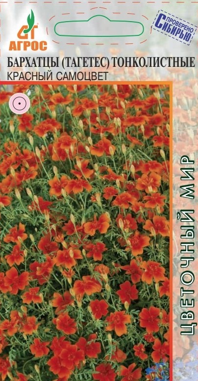 Однолетник с огромным количеством мелких темно-красных соцветий диаметром 2-3 см. Растение изящное, цветение длительное. Причем бутоны и молодые цветки находятся на периферии куста, а отцветшие – внутри, что придает растению постоянно свежий и аккуратный вид. Бархатцы тонколистные обладают своеобразным, сильным и приятным ароматом. Бархатцы неприхотливые, быстрорастущие, засухоустойчивые и светолюбивые растения, но выносят небольшое затенение, поэтому ими можно оформлять участки с северной стороны строений. Зацветают через 2 месяца после посева. Семена на рассаду высевают в начале апреля, но для более раннего цветения их можно посеять в марте. В грунт высаживают, когда минует угроза заморозков. Всходы появляются через 10-14 дней. Бархатцы гармонично выглядят в любых цветниках. Их можно использовать в контейнерах и корзинах, высаживать в балконные ящики. Кроме того, бархатцы оказывают санитарное воздействие на почву. Хорошо и долго стоят в срезке.