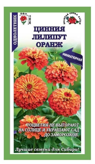 Выразительная цинния серии Лилипут, очень обильно цветущая до самых заморозков и образующая плотные компактные кустики, которые густо ветвятся от самого корня. Соцветия насыщенного оранжевого цвета не выгорают на солнце и не тускнеют. Цинния – это великолепное украшение сада летом и осенью. Используется для посадки в различные цветники, прекрасно растет в вазонах, кашпо и ящиках.