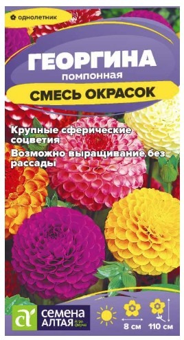 Великолепная смесь однолетних георгин с крупными махровыми сферическими соцветиями различных окрасок диаметром до 8 см. Кусты высотой до 110 см, цветоносы длинные крепкие. Используется для выращивания в миксбордерах среди многолетников, для одиночных посадок в палисадниках и на газонах. В цветниках идеально сочетается со среднерослыми однолетними астрами, превосходна в срезке.