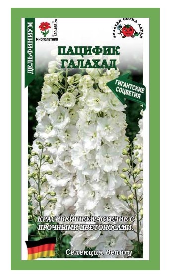 Красивейшее растение с прочными цветоносами. Полумахровые белоснежные цветочки собраны в крупные многоцветковые соцветия. Дельфиниумы Пацифик долго не теряют декоративности, используются в цветниках и букетах, зацветают в конце июня – июле, при надлежащем уходе повторно в августе-сентябре.