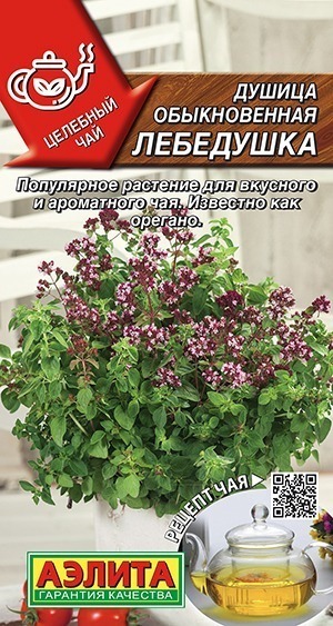 Многолетнее пряное растение, известное еще как “Орегано”. Пользуется особой популярностью у огородников. Эффектно цветет всё лето и способно отпугивать большинство вредителей от огорода. Отличный медонос. Кустики ветвистые, высотой 50-70 см, прекрасно зимуют без укрытия. Для чаев и настоев собирают цветущие побеги с листьями в июле, начиная со второго года вегетации. С растения срезают несколько стеблей на высоте 15-20 см от поверхности почвы. Настои из душицы успокаивают нервы и дают обезболивающий эффект. Чай из душицы имеет нежный цветочно-карамельный вкус и аромат.