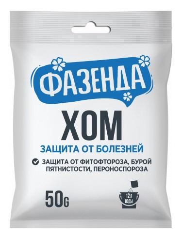 Хом – фунгицид, предназначенный для лечения пятнистостей и ржавчины у цветочных и декоративных культур, а также против пероноспороза на огурцах и луке, фитофтороза помидоров и картофеля, против курчавости листьев персика, парши груш и яблонь, милдью винограда и гнили сливовых плодов. Используют для борьбы против грибковых болезней.