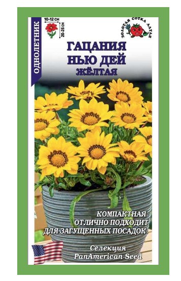 Гацании серии New Day компактны, отличаются простотой выращивания, отлично подходят для загущенных посадок, держат цветок открытым до позднего вечера. Кустик крепкий, ветвистый, шириной 15-20 см. Очень крупные солнечно-желтые соцветия с темным кольцом вокруг центра придают неповторимое очарование клумбам, бордюрам, каменистым горкам, украшают вазоны, кашпо и ящики.