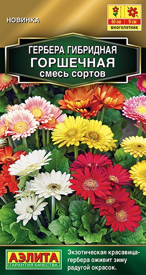 Одно из самых удивительных и впечатляющих своей красотой растений. На юге прекрасно растет в открытом грунте. В средней полосе – это горшечный теплолюбивый многолетник, чаще всего выращиваемый дома или в оранжерее. Гербера отличается длительным периодом цветения – до 4 месяцев. Густые прямостоячие кустики вырастают до 45-60 см. Цветоносы опушенные, крепкие. Соцветия крупные ( ? 7-9 см), насыщенных оттенков. Смесь отлично подходит для классической букетной срезки. В летний период может расти в вазонах – в садовых беседках и патио.