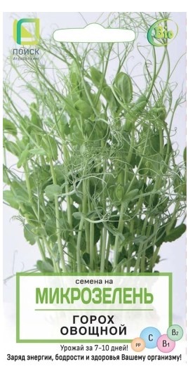 Ценный источник протеина Оказывает омолаживающее действие Нежная сочная микрозелень имеет вкус молодого горошка с легким оттенком ореха. В пищу используются листья, усики, стебли, как ингредиенты для салатов, так и в отваренной форме в овощных супах и в составе рагу. Ростки гороха содержат фосфор, витамины группы В, Е, С, РР, К, протеины. Способствуют снижению сахара в крови, выведению токсинов, росту и регенерации клеток, обладают противоопухолевой активностью. В состав входят семена гороха овощного Триумф.