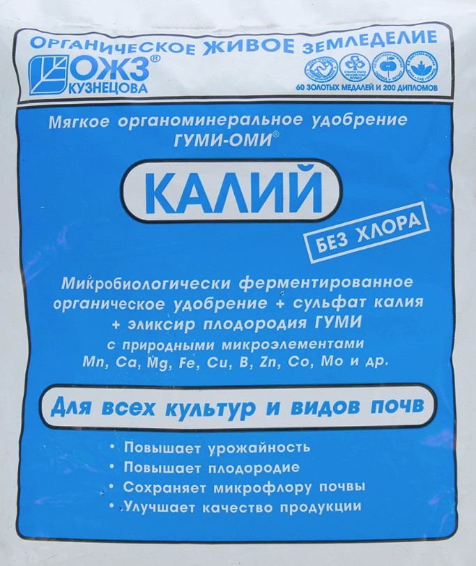 Порошково–гранулированное удобрение с необходимыми для питания растений макро- и микроэлементами и эликсиром плодородия Гуми, с высоким содержанием калия. Повышает урожайность, плодородие, улучшает структуру почвы и улучшает качество продукции.