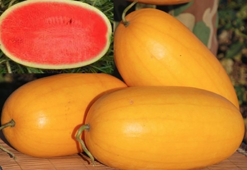Урожайный и очень красивый тайский гибрид раннего срока созревания. Неприхотлив, устойчив к низким температурам и слабому освещению. Мякоть красная, хрустящая, сочная. Содержание сахара очень высокое — 14 градусов по шкале Брикса (до 14,2). Плоды овальные, золотистого цвета — 4-5 кг.