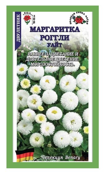 Очаровательное низкорослое растение, используемое для декорирования края водоемов, украшения переднего плана миксбордеров и создания бордюра, высаживаемое в альпинарии, вазоны и балконные ящики. Маргаритки прекрасно сочетаются с незабудками и виолами, отлично подходят для составления миниатюрных букетиков. Лопатчатые листочки собраны в пышную прикорневую розетку, над которой на второй год вырастают крепкие безлистные цветоносы. Соцветия густомахровые, белоснежной окраски. Сорта серии «Roggli» от немецкой компании «Benary» характеризуются более крупными соцветиями, хорошей морозостойкостью, ранним и длительным цветением не только на солнце, но и в полутени.