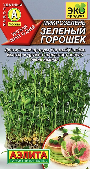 Микрозелень Зеленый горошек – продукт низкой калорийности, богатый белком, легко усваивается. Идеально подходит для сторонников диетического питания. Отличается высоким содержанием витаминов группы В и антиоксидантов. Молодую зелень рекомендуется использовать в качестве гарнира, в составе салатов, отваривать или тушить в сливках. Состав: горох овощной Триумф.