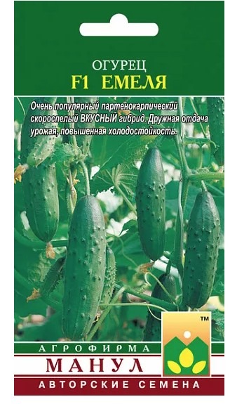 Огурец F1 Емеля — скороспелый урожайный партенокарпический гибрид женского или преимущественно женского типа цветения для весенних теплиц, тоннелей, открытого грунта. Растения сильнорослые, с укороченными междоузлиями; ветвление среднее или ниже среднего. Зеленцы интенсивно-зеленого цвета, крупнобугорчатые белошипые, овально-цилиндрической формы, длиной 13-15 см, очень высоких вкусовых качеств, хороши для засолки и консервирования. Для гибрида характерны дружная отдача урожая и повышенная холодостойкость. Урожайность F1 Емеля, несмотря на более короткие зеленцы, держится на уровне гибридов Зозуля и Апрельский, а в годы с ненастным летом превосходит их.