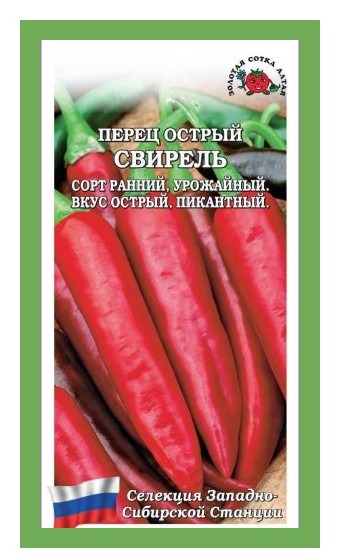 Ранний урожайный сорт для возделывания в открытом грунте. Растение полураскидистое, средней высоты. Плоды пониклые, узкоконусовидные, средней длины, массой около 20 г, гладкие, глянцевые, в технической спелости зеленые, в биологической — красные. Вкус хороший, пикантно-острый. Используют в качестве приправы, при изготовлении настоек и консервировании.
