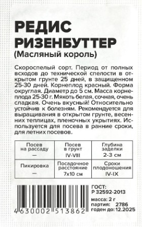 Скороспелый сорт. Период от полных всходов до технической спелости в открытом грунте 25 дней, в защищенном 25-30 дней. Корнеплод округлый, красный, диаметром до 5 см, массой 25-30 г. Мякоть белая, сочная, очень сладкая и вкусная. Относительно устойчив к болезням. Рекомендуется для выращивания в открытом грунте, весенних теплицах, пленочных укрытиях. Используется для посева в ранние сроки, для летних посевов.