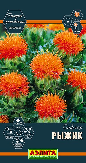 Привлекающий внимание, эффектный однолетник. Помимо его неоспоримых декоративных качеств, сафлор знаменит как масличное и медоносное растение. Высота* куста около 40-45 см, шипы редкие. Пышные апельсиновые цветки Ø 4 см красиво контрастируют с изумрудными листьями. Они содержат пигмент картамин – известный желтый краситель для пищевых продуктов и тканей. Из семян выделяют масло, обладающие целебными и косметическими свойствами. Сорт используется в свежем букете, подходит для цветников и бордюров. Растительные остатки применяются в качестве сидератной культуры.