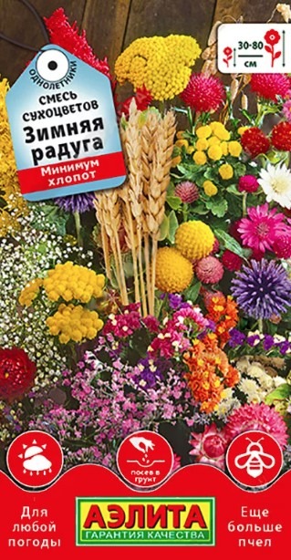 Зимняя радуга – это смесь неприхотливых цветочных культур из группы сухоцветов, которые не требуют особенного ухода и условий выращивания, но при этом неповторимо красивы как в цветнике, так и в букете. Для составления сухих композиций растения необходимо срезать в разгар цветения и высушивать в темном помещении цветоносами вниз. Для дальнейшего поддержания цвета и формы можно использовать специальный лак. В дождливые осенние дни и хмурые зимние месяцы яркий пышный букет из сухоцветов создаст солнечную атмосферу летнего сада.
