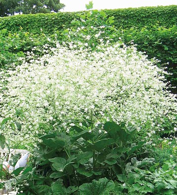 Множество белоснежных небольших цветков образует могучие эффектные соцветия. Растение очень воздушное, заметное, будет отличным выразительным акцентом в вашем саду. Листья крупные, сердцевидные.