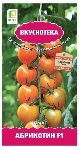 Необычная абрикосовая окраска и великолепный десертный вкус. Раннеспелый гибрид для пленочных теплиц. Период от всходов до начала плодоношения 95-100 дней. Растение индетерминантное, высотой 150-170 см, нуждается в подвязке, формировка в 1-2 стебля с удалением пасынков. Обильный, неприхотливый. Плоды округлые, гладкие, блестящие, массой 16-20 г, собраны в красивые компактные кисти по 12-14 штук. Окраска желто-оранжевая (абрикосовая). Вкус кисло-сладкий с фруктовыми нотками. Пригоден для уборки целыми кистями. Устойчив к вирусам, фузариозному увяданию, бурой пятнистости листьев.