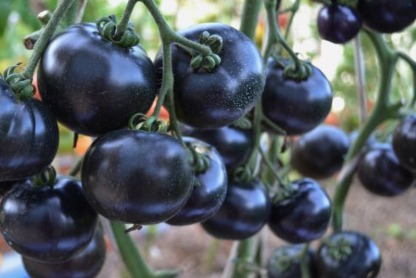 Форма томата округлая, ровная без ребристости. Плоды данного сорта необычной окраски, которая содержит зеленую мякоть в разрезе и фиолетовые разводы у плодоножки на желтом фоне. Встречаются плоды с разводами и темно-синего цвета, этот нюанс зависит от реакции растения на ультрафиолет солнечных лучей. Вес плодов в среднем 80-100 гр. Мякоть очень сочная, сладкая, толстостенная. Плод сладковатый, с легкой кислинкой, во вкусе присутствует смесь экзотических фруктов и томатов черри. Аромат плодов свежий, нежный, с фруктовыми палитрами.