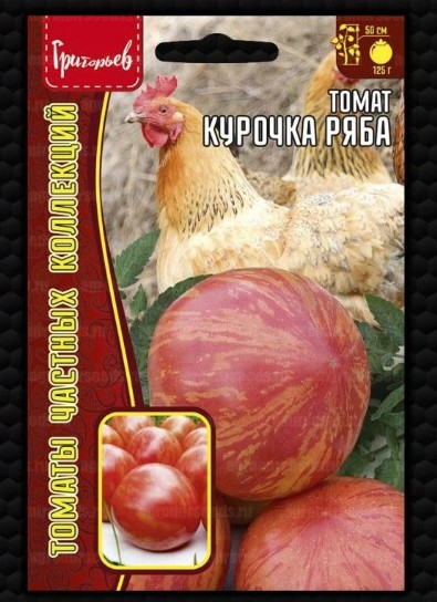 Томат Курочка ряба — детерминантный ультрараннии томат. Томат сорта Курочка ряба прикрывает плоды своими листьями, как курица цыплят. Это несомненный плюс этого сорта, так как в жаркое лето помидоры не придется укрывать от солнца. Сами растения стелющиеся, низкорослые — всего 30 — 50 см высотой. Пасынкование не требуется. Плоды округло-вытянутые, плотные, розовато-красные, с желтыми полосками, весом 100 — 150 грамм. Урожайность очень высокая. Легкость и транспортабельность томатов хорошая. Курочка ряба отлично подходит как для потребления в свежем виде, так и для консервирования. Томат хорошо зарекомендовал себя при безрассадном способе выращивания. Семена сохраняют хорошую всхожесть 5-6 лет.