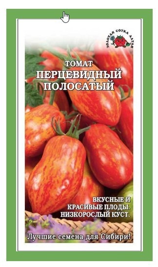 Среднеспелый кистевой сорт томата, дающий высокий урожай как при выращивании в теплице, так и в открытом грунте. Куст крепкий, детерминантный, хорошо облиственный, высотой в теплице около метра, в открытом грунте не выше 70 см. Формировать растения рекомендуется в 3-4 стебля. За сезон на кусте завязывается до 5 кистей по 6-9 помидоров. Плоды перцевидные, плотные, массой 80-120 г, в длину могу достигать 15 см, в стадии зрелости красные в золотистую извилистую полоску, очень красивые. Эти помидоры хороши для свежих салатов и консервации, при которой остаются плотными, не растрескиваются и не раскисают, цвет не меняют.