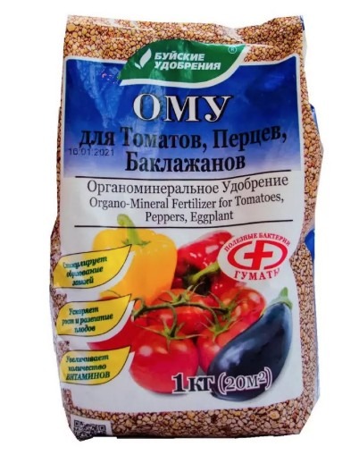Удобрение «ОМУ» для томатов, перцев, баклажанов — комплексное гранулированное удобрение на основе низинного торфа, состоящего из гуминовых соединений, макро- и микроэлементов, предназначено для основного внесения в почву и для томатов, перцев, баклажанов.