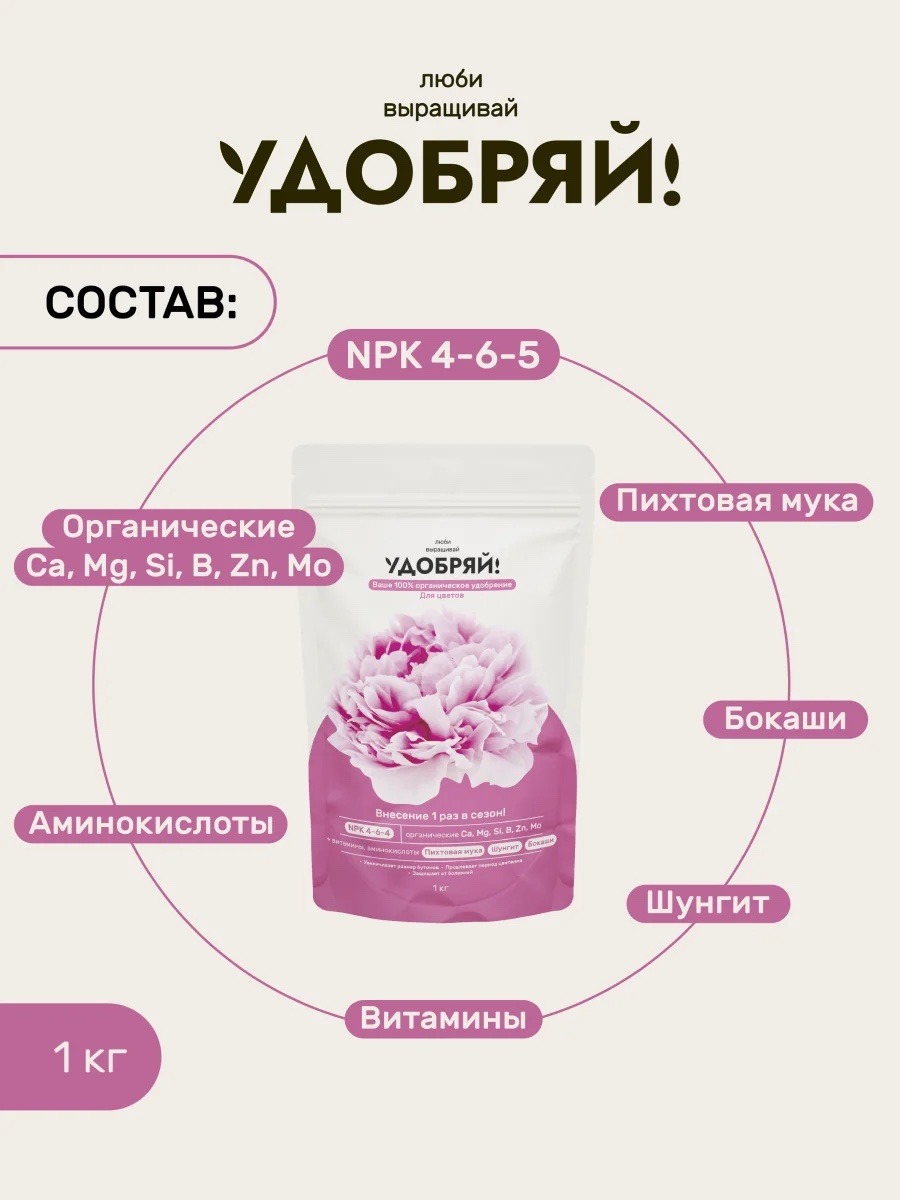 Состав: кровяная (белок альбумин и железо) мука КРС; костная мука (фосфор, кальций); органические калий; магний; кальций; пихтовая мука; бокаши; комплекс аминокислот и витаминов